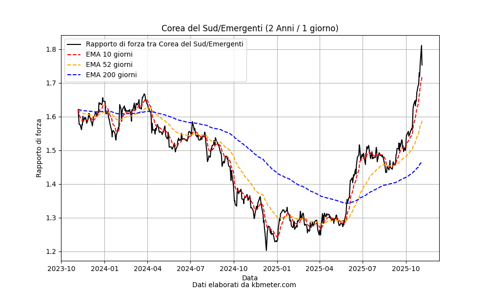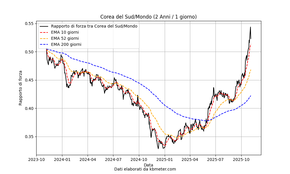Nei due grafici sopra riportati osserviamo l’andamento del rapporto di forza dell’azionario della Corea del Sud con l’azionario emergenti (primo grafico) e con l’azionario mondiale. Ben visibile l’accelerazione al rialzo in essere da inizio 2025, con un’ulteriore spinta arrivata a fine estate. Gli indicatori hanno registrato il cross al rialzo della media mobile a 50 giorni rispetto alla media mobile a 200 giorni, un segnale rialzista.