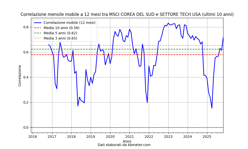 Nel grafico qui sopra osserviamo l’andamento della correlazione tra azionario Corea del Sud e settore tecnologico dello S&P500. Notiamo innanzitutto il livello attuale dell’indice di correlazione, superiore a 0,8 e prossimo ad una correlazione positiva quasi perfetta. Negli ultimi 10 anni l’indicatore si è mantenuto sempre in zona positiva con una media di 0,58.