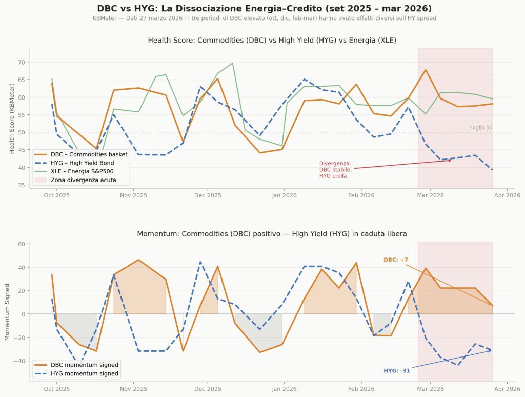 La divergenza tra Energia e Credito High Yield sta emergendo. L’HYG, il principale ETF che raccoglie il debito delle aziende ad alto rischio statunitensi, ha perso salute, momentum e posizione tecnica a una velocità che non si vedeva dal 2022.