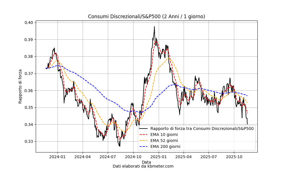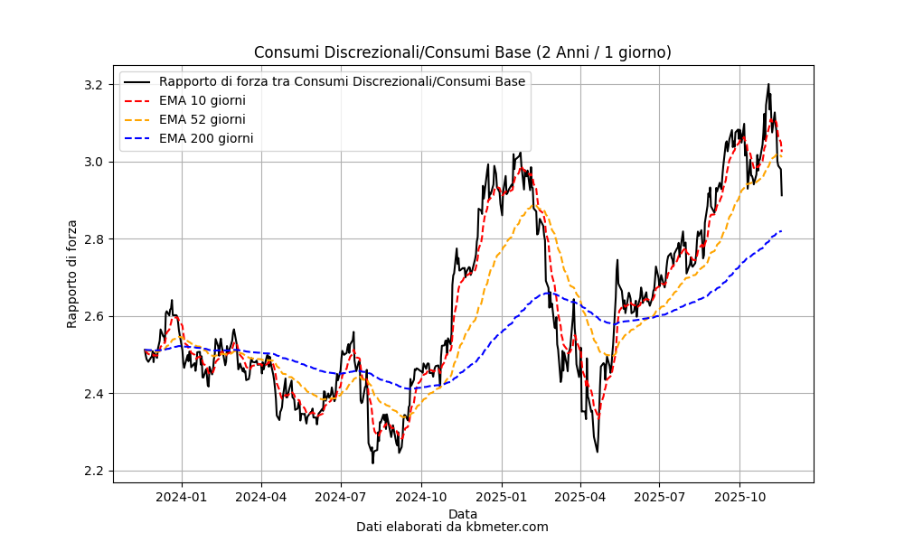 Nel grafico qui sopra osserviamo l’andamento del rapporto di forza tra il settore dei consumi discrezionali e quello dei consumi base negli Stati Uniti. L’indicatore mostra una brusca frenata sul finire di ottobre, con la conseguente discesa al di sotto della media mobile a 50 giorni. Un potenziale indizio di rottura del trend che non può, però, essere al momento confermato, ma che segnala un peggioramento del sentiment delle famiglie statunitensi.