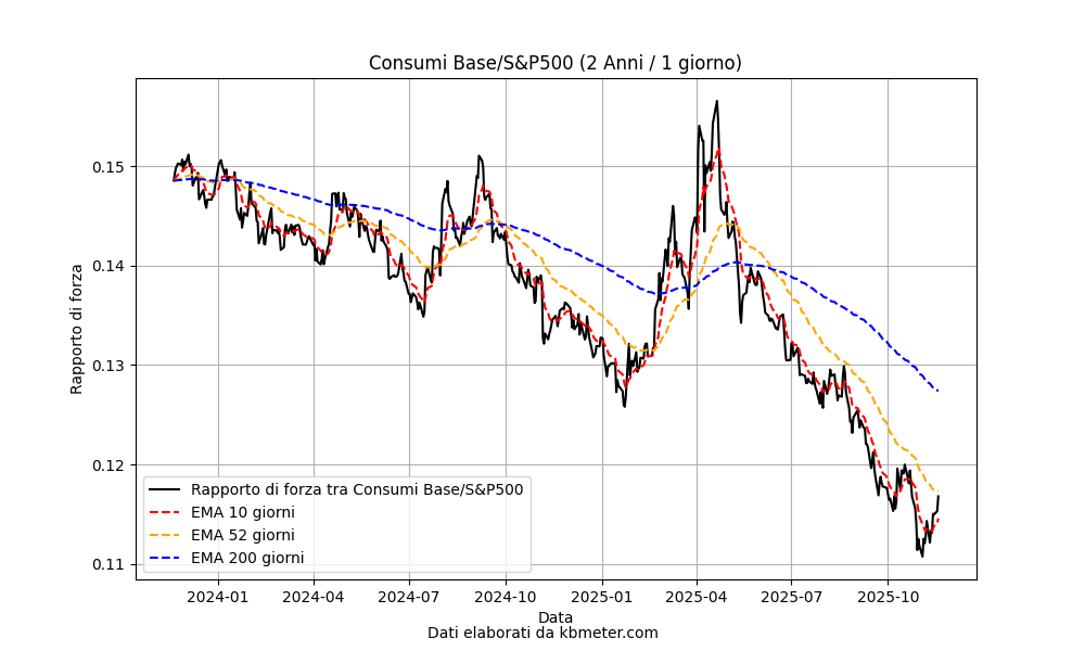 Analizzando l’andamento dei due settori rispetto all’indice principale (S&P500), troviamo conferme dell’indebolimento dei consumi discrezionali. Un movimento iniziato ben prima della frenata descritta in precedenza e che ha visto il rapporto scendere sotto la media mobile a lungo termine. Ora la configurazione è tecnicamente ribassista. Allo stesso tempo, grafico a destra, si nota il rimbalzo dai minimi a due anni del rapporto tra consumi base e indice, con l’indicatore che torna nella zona della media mobile a 50 giorni.