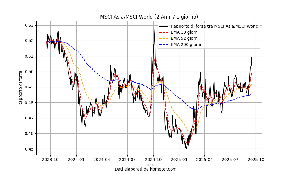In the chart above, we can observe the strength ratio between Asian equities and World equities, calculated using two ETFs that track the performance of the respective indices. Notable is the crossover of the 50-day moving average with the 200-day moving average—a bullish signal—that occurred around last April, followed by a highly volatile but positive trend that continues to this day. The sharp rise in recent weeks has been driven primarily by expectations of rapid interest rate cuts by the U.S. Federal Reserve. Such moves would lower financing costs globally and provide relief to pressured bond markets