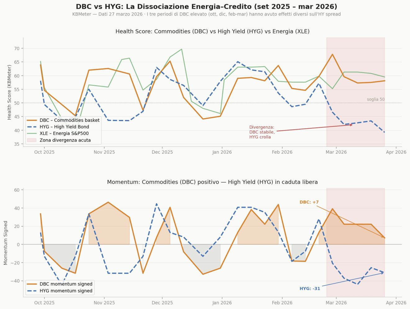 The divergence between Energy and High Yield Credit is emerging. HYG, the main ETF tracking U.S. high-yield corporate debt, has lost health, momentum, and technical positioning at a pace not seen since 2022. A particularly useful intermarket indicator to gauge how aware markets are of the risks to the real economy from the current geopolitical situation is the High Yield spread—that is, the premium investors demand to lend to riskier companies.