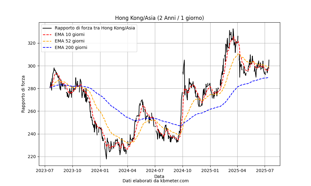 This performance has made the Hong Kong market one of the top performers in Asia, with a 23% gain since the beginning of the year. In the chart above, we also see the relative strength between the Hang Seng and the Vanguard FTSE Pacific ETF. It shows how the Hong Kong index began to outperform from late summer 2024.