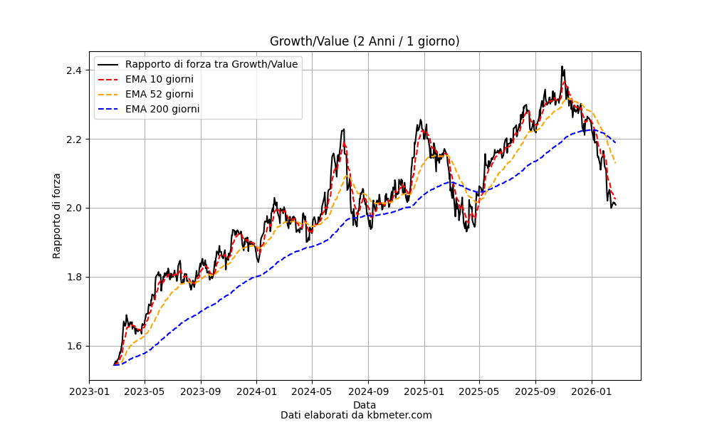 The chart above shows the performance of the relative strength ratio between US Growth equities and US Value equities. As can be seen, the indicator maintained a clearly upward trend until the end of 2025, before reversing course and breaking below the 200-day moving average in early 2026. Currently, the index is at its lowest level since late last spring and remains in a decidedly bearish configuration.