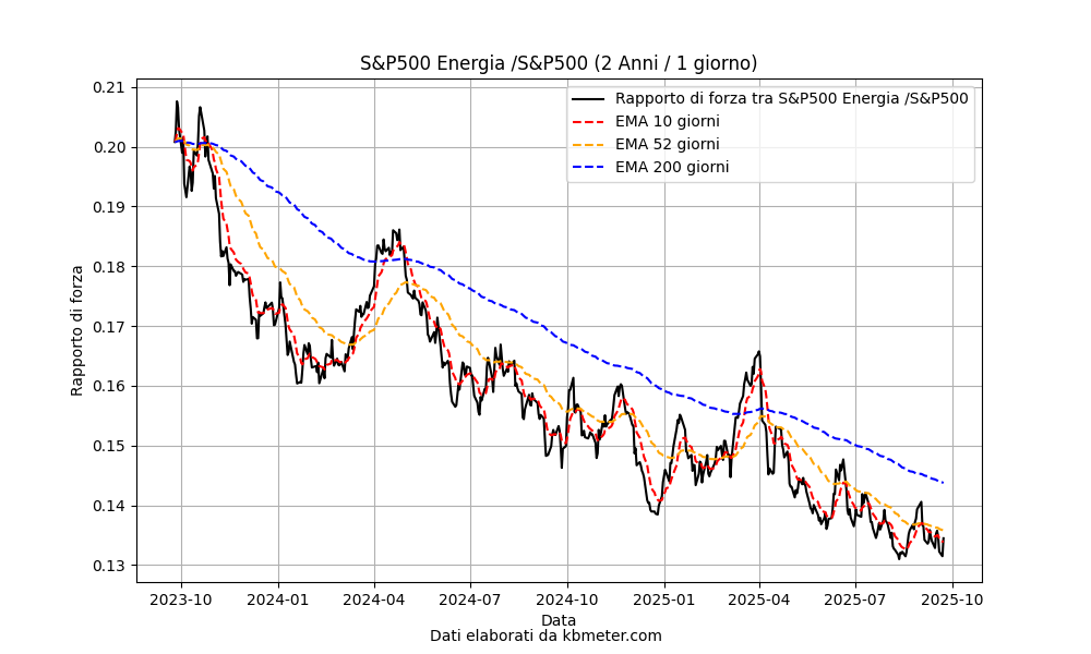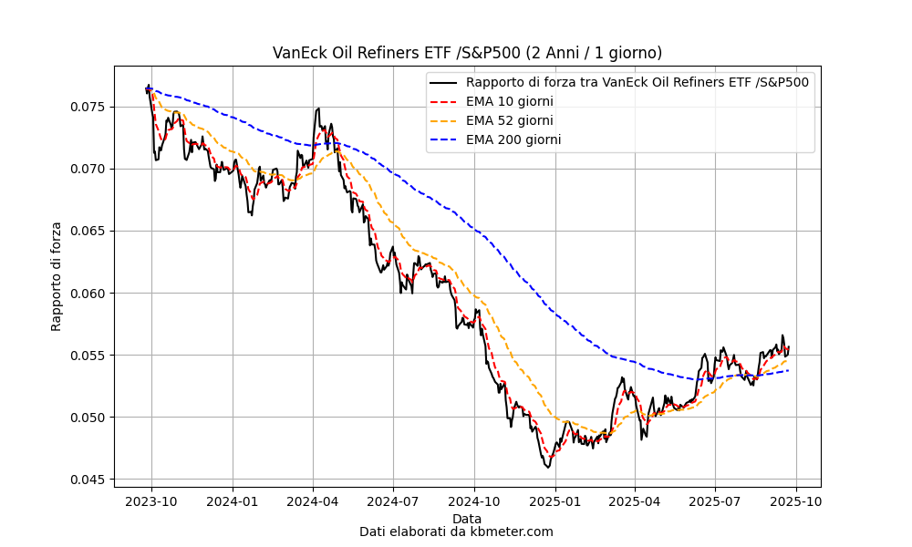 Looking at the relative strength ratio between the ETF investing in this industry and the S&P 500, we can see that since the beginning of 2025 there has been a trend reversal, with the indicator rising and crossing above its long-term average. This is a sign of strength for the oil refining industry, which becomes even more evident when compared solely to the U.S. energy sector.