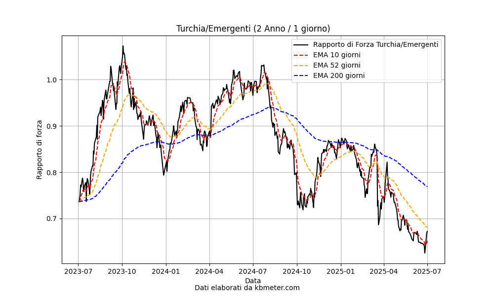 Looking at the relative strength chart between the MSCI Turkey Index and the MSCI Emerging Markets Index, the prolonged period of weakness since mid-July last year is clearly visible. A first attempt at a rebound toward the end of 2024 was subsequently halted. Now, a movement recorded in June offers a glimmer of hope for a potential recovery.