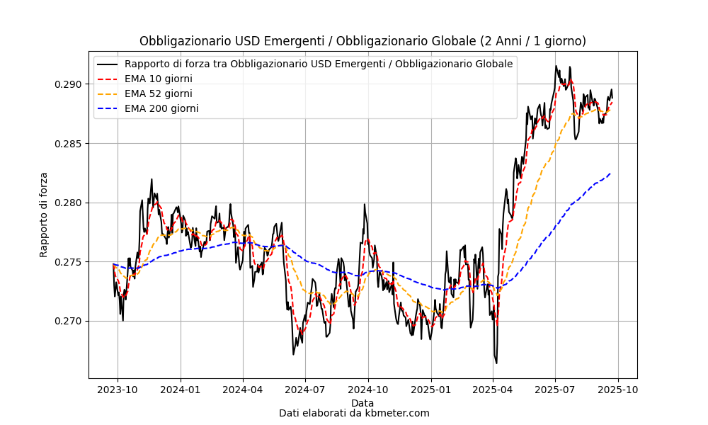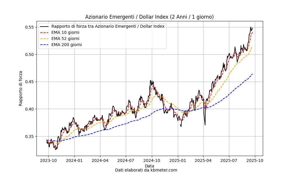 Below, we observe the trend of the relative strength ratio between emerging market equities and the dollar and note that the indicator has accelerated upward since last spring.